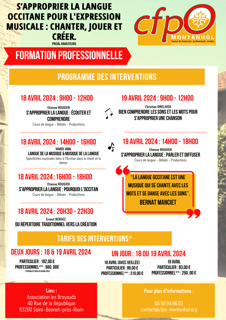Que vous soyez débutant ou déjà familier avec l’occitan, cette formation vous permettra de progresser dans un environnement accueillant et inspirant. Rejoignez-nous pour une aventure linguistique, culturelle et musicale inoubliable !